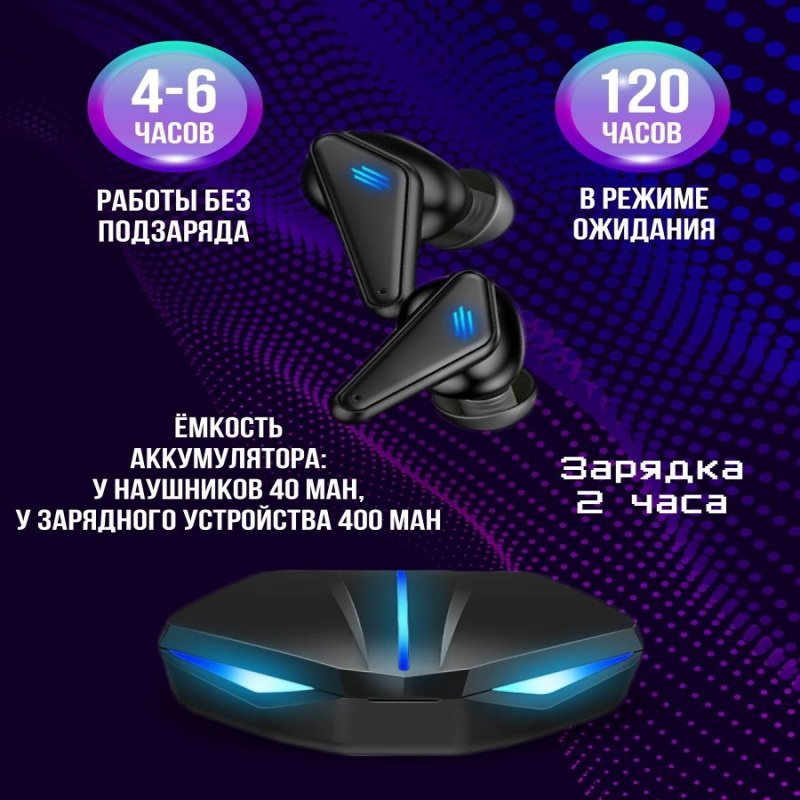 Беспроводные игровые TWS наушники K55 с активным шумоподавлением, влагозащитой и подсветкой. Наушники передают звук с минимальной задержкой, незаметной для человеческого слуха. При изъятии наушников из кейса происходит автоматическое подключение наушников к вашему смартфону (если ранее было произведено сопряжение). Качество звука не меняется даже при отдалении от телефона на расстояние 10-15 м. Наушники питаются от кейса. Заряда наушников хватает до 5 часов (зависит от громкости) беспрерывного прослушивания музыки. С помощью сенсоров вы можете принять поступающие звонки, поставить музыку на паузу, переключить песню или изменить собственный уровень громкости наушников. Подходят для всех ОС телефонов с Bluetooth 5.0. Внимание! Если один из наушников не включился при сопряжении, воспользуйтесь длительным нажатием на сенсор наушника до характерного звука.